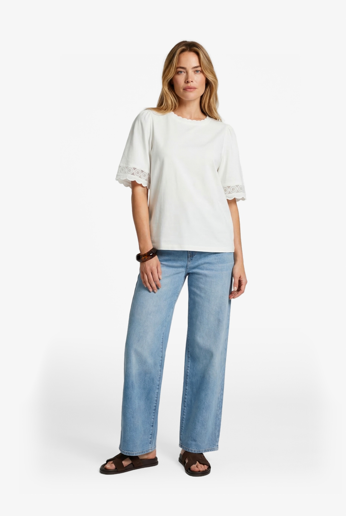 De Thessa top is een verfijnde basic met een zachte en vrouwelijke uitstraling. Het model heeft een ronde hals en halflange mouwen met een subtiele kanten afwerking, wat zorgt voor een elegante en speelse touch. De soepele stof draagt comfortabel en geeft de top een mooie, rustige fit. Perfect te combineren met een jeans of pantalon voor een moeiteloos verzorgde en stijlvolle look.